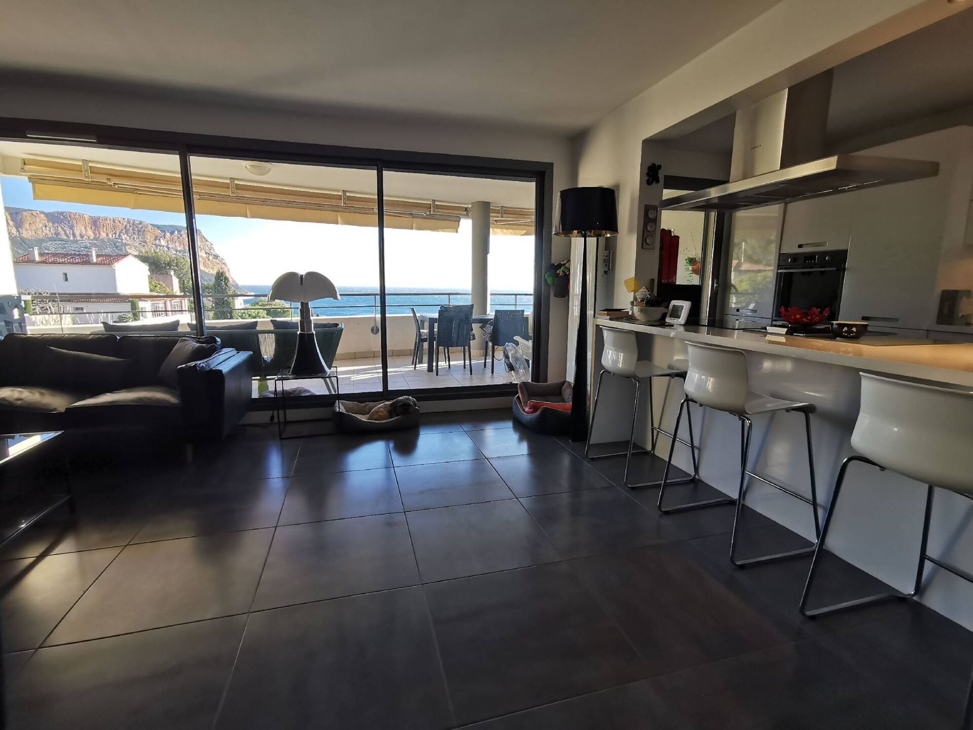 alt="Salon carrelage ensoleillé lumineux vue mer et cap canaille " title="Salon carrelage ensoleillé lumineux vue mer et cap canaille "/>